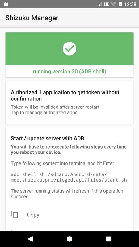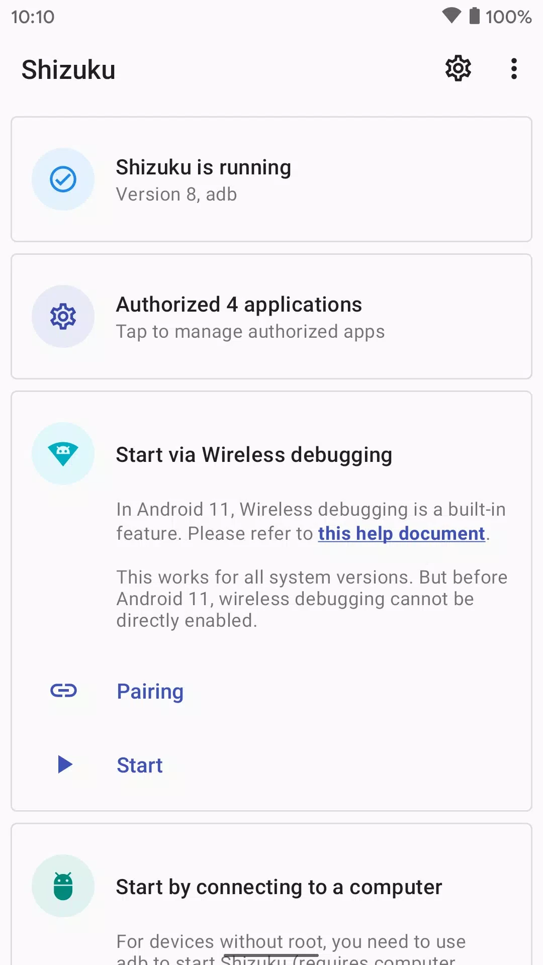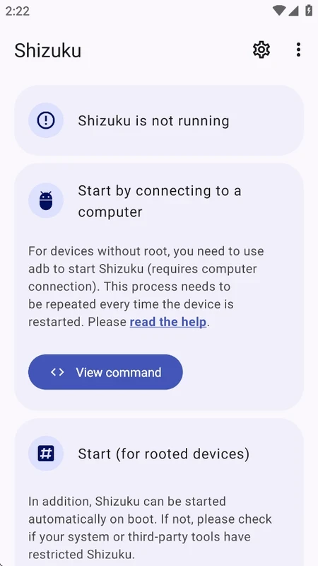 Приложение поддерживает два способа запуска сервера Shizuku: ADB для установки без root-прав или с root-правами, если они доступны. Перезагрузка устройства обеспечивает быстрый запуск в режиме ADB. В режиме root-прав также возможна простая перезагрузка, и вы можете выбрать способ в соответствии со своими потребностями.